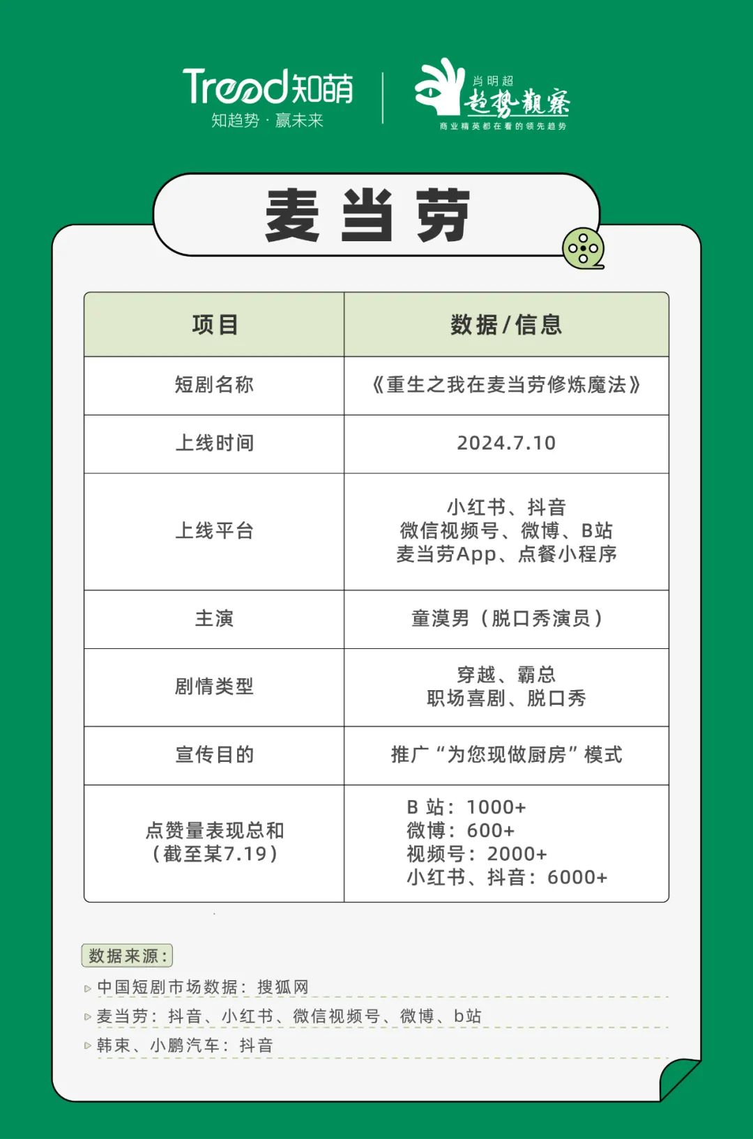 近期,麦当劳的《重生之我在麦当劳修炼魔法》无疑是一个引人注目的创新尝试。麦当劳中国为庆祝“为您现做厨房”18周年,推出了品牌首部自制短剧。短剧在微信视频号、小红书、抖音等多个平台上线,上线一小时,全平台播放量即破千。通过短剧形式,第一次将麦当劳厨房从幕后“搬”到台前,让消费者更直观地了解“为您现做”的厨房模式。并携手人气脱口秀演员童漠男作为推荐官,共同打造并推广这部短剧。而短剧营销和“10元吃堡”活动的结合,有效吸引了消费者的关注和参与,进而促进了产品销售。