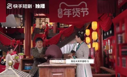 将品牌热门产品作为推动剧情发展的重要道具,融入到故事情节当中,让观众更为直观的了解到产品用法、优势、适用场景等。天猫年货节在快手冠名的另一档短剧《我在大宋开酒吧》邀请到了《甄嬛传》的“温太医”和“沈眉庄”,剧中出现了一段“沈眉庄”在古代开“超市”的情节,超市中挂着天猫年货节的横幅,“满减”“包邮”“信鸽客服”等在天猫网购中常见的服务场景则在剧中多次出现,推动着剧情发展。