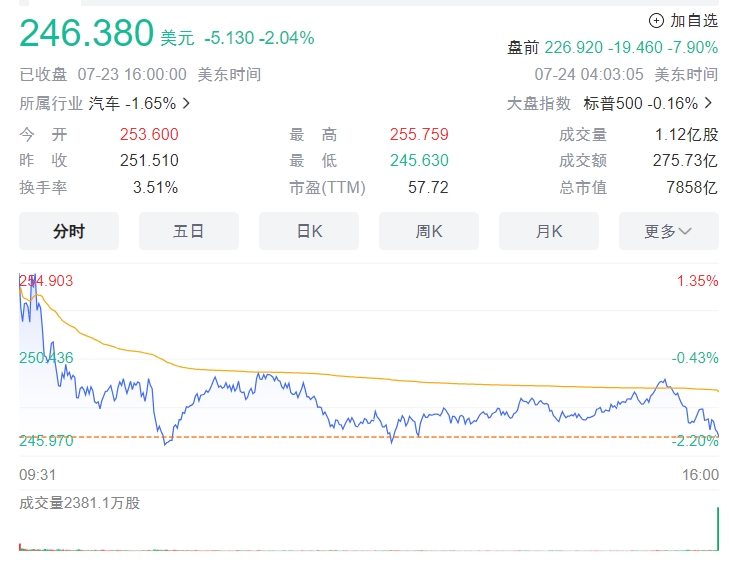 净利润的大幅度下跌,让财报发布之后的特斯拉,股价大跌,截至发稿,特斯拉开盘后的股价跌幅接近8%。按照7858亿美元的收盘市值来算,特斯拉的市值蒸发了600多亿美元,折合人民币超过4000亿元。