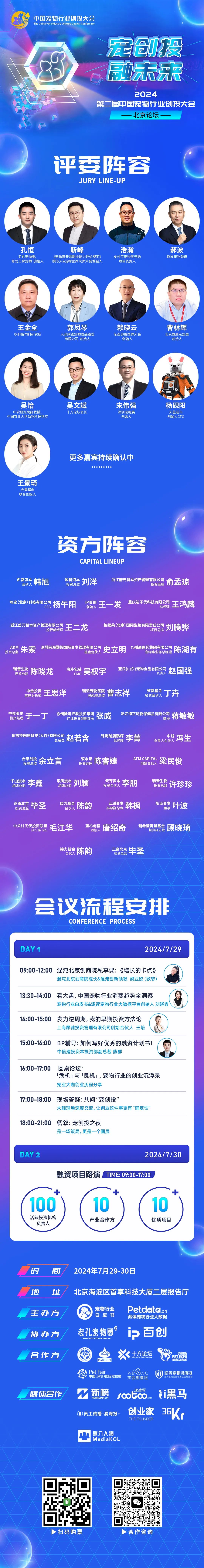 为了更好的链接起行业投融资资源,激活宠物行业资本活力,由中国宠物行业创投大会组委会发起,宠物行业白皮书及派读宠物行业大数据平台主办,IP百创、老孔宠物圈协办,中国兽医协会、中国质量检验协会宠物食品用品专业委员会、十方论坛、雄鹰京宠展、深圳国际宠物展、东西部兽医平台、润合供应链、等支持的2024年第二届中国宠物行业创投大会(以下简称“宠创投”)升级归来,正式定档,于7月29~30日在北京海淀首享科技大厦正式举办。届时,百余名投资方代表与宠物行业各领域创业项目将齐聚北京,共同展示宠物行业最前沿的科创魅力。