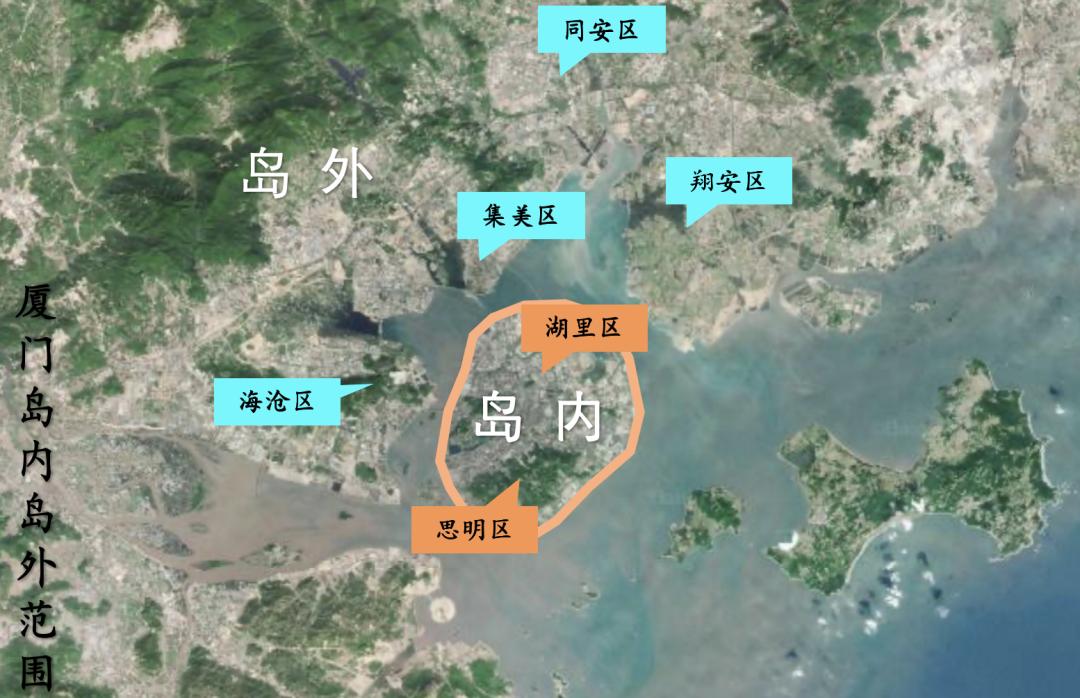 整个厦门6个区因海划分为岛内和岛外,其中位于厦门市区的思明区、湖里区被称为岛内,其余4个合在一起为岛外。