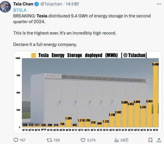 特斯拉上半年储能电池累计安装量已经达到 13.5 GWh,接近特斯拉去年全年的 14.724GWh 储能部署量。