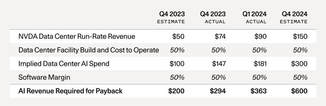 如下图所示,该文章的推断逻辑是:英伟达芯片运营的收入应为数据中心总成本的50%(另一半是能源和建筑成本);而数据中心的成本应该占AI企业为硬件设施付出的成本的50%。也就是说,AI行业的年产值应为英伟达营收的4倍。