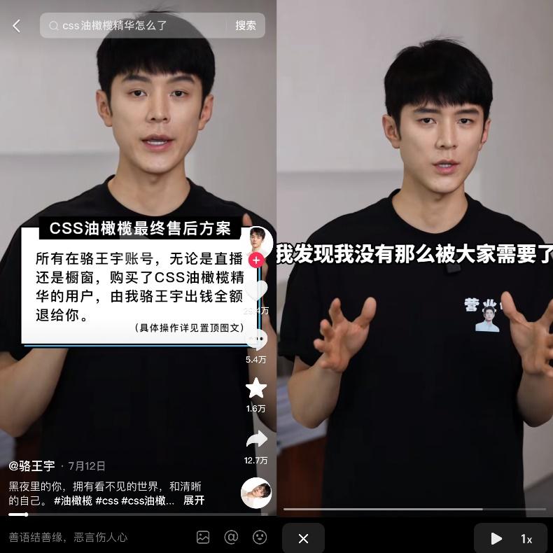 事情起因是骆王宇带货的一款“CSS油橄榄精华”被爆出实际检测中没有备案中提到的橄榄苦苷和羟基酪醇这两种成分,因此产品功效以及合法性存疑。风波出现后,品牌方迟迟不愿退款,最终骆王宇决定与机构共同承担1.5亿元的商品退款。