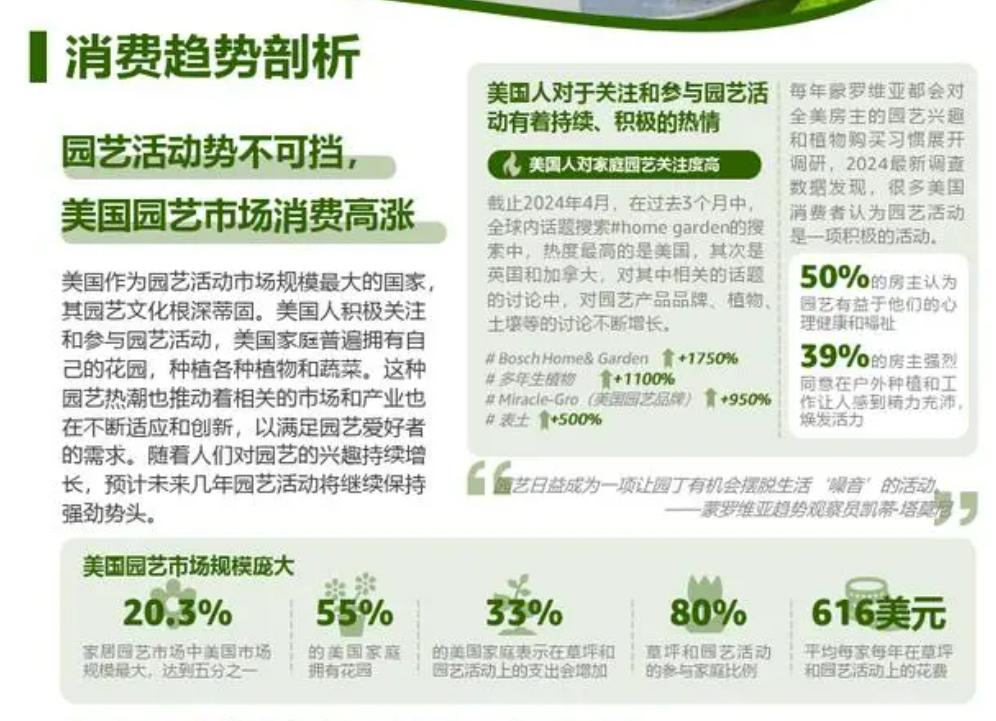 亚马逊凭借其数据库分析了美国、欧洲、日本等地的消费趋势,指导其商家更有针对性地制定选品策略和规划。《报告》提出的全球市场的六大最新消费趋势中,“从种子到花园”的全面园艺产品需求对应了典型北美家庭的日常生活方式;欧洲市场越来越重视情绪价值的满足,能唤起正面情绪的产品和服务正在爆发出新的商机。