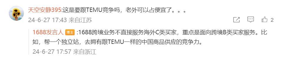需要指出的是,作为汇集众多源头厂商的 B2B 电商,1688 的跨境业务与当前诸多出海平台的主攻方向不同,如其官方微博所言,“1688 跨境业务不直接服务海外 C 类买家,重点是面向跨境 B 类买家,比如帮一个独立站拥有跟 Temu 一样的中国商品供应的竞争力。”