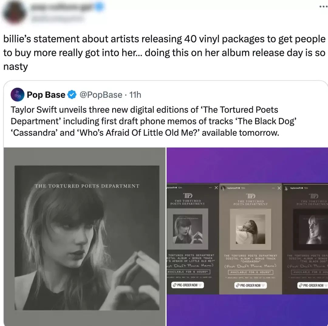 今年5月,Billie Eilish经纪人更是在社交平台公开转载推文指责Taylor Swift“打压其他女歌手”、“总是在其他歌手发布新专辑或可以达成榜单纪录时突然发布新改版专辑”,不少音乐人粉丝也纷纷加入指责行列,认为Taylor Swift在今年发布的《苦难诗社》多个版本是恶意打压同行的举措。