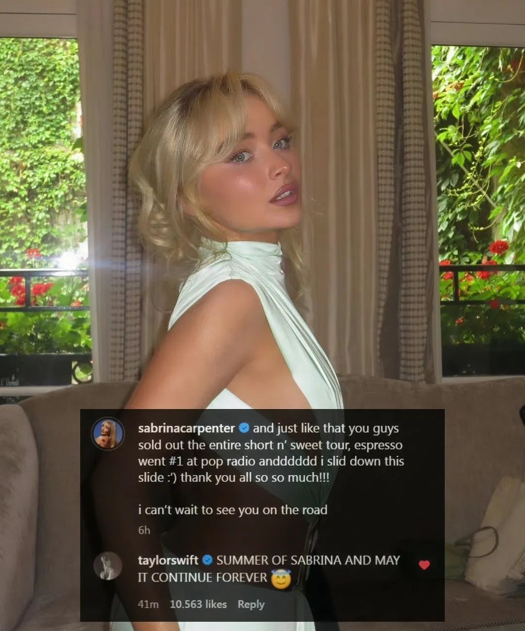 有趣的是,在7月5日,Taylor Swift更是在Sabrina Carpenter庆祝歌曲成功、巡演大卖的帖子下留言称,“这是Sabrina的夏天,愿它永远持续下去”。不出所料,这一留言一石激起千层浪。