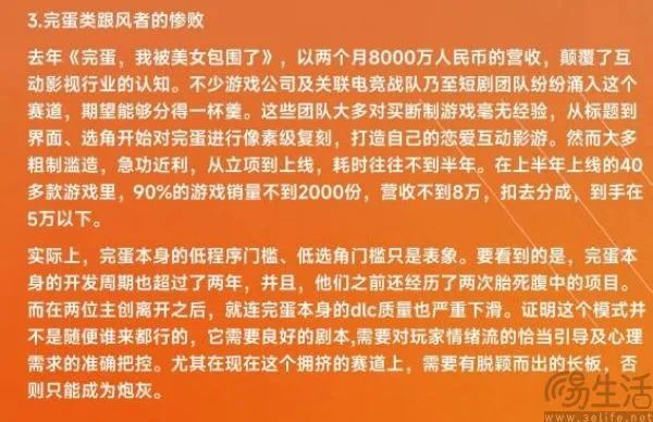 可现实真是如此乐观吗?据专注统计国产买断制游戏销量的@国游销量榜 在7月19日发布的“2024年国游销量半年榜”显示,大批跟风的真人恋爱互动影游可以称得上是血本无归。