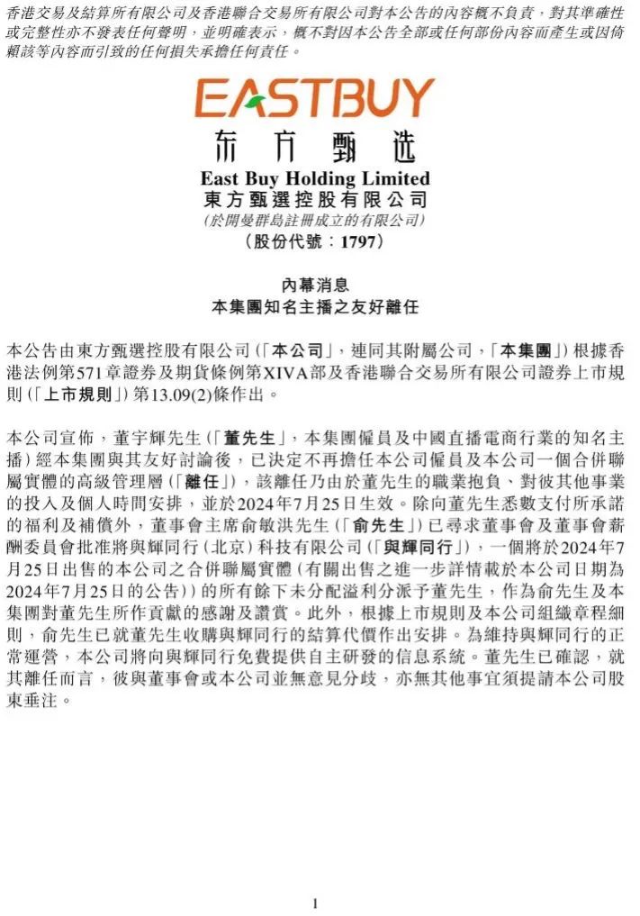 而在昨晚的公告中明确表示,董宇辉已决定不再担任公司雇员及公司一个合并联属实体的高级管理层,该离任乃由于董宇辉的职业抱负、对其他事业的投入及个人时间安排。