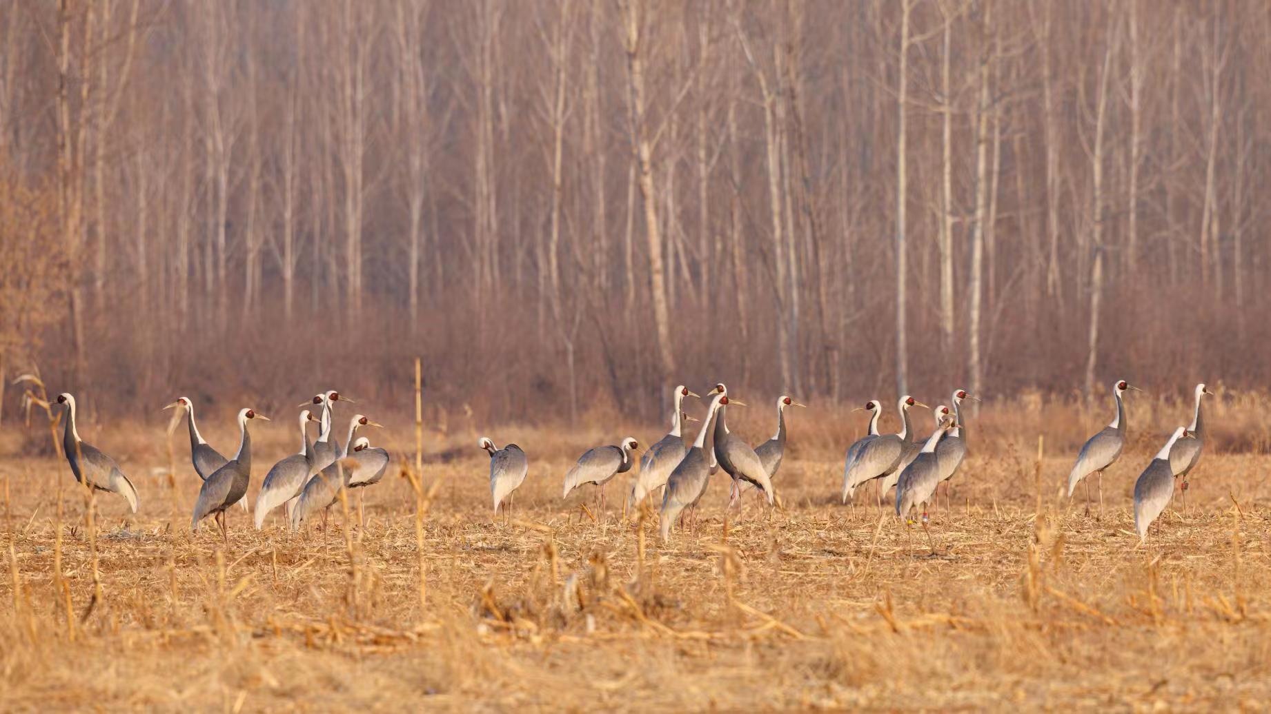 国家一级保护动物白枕鹤正在北京密云近自然森林经营及鸟类栖息地优化项目地停歇觅食