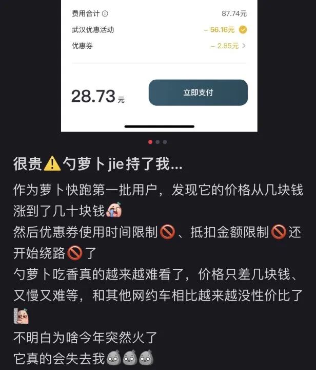 例如,小红书上的一位用户直言不讳地表示:“萝卜快跑的性价比越来越低,价格已经与网约车相差无几,但等车时间长、行驶速度慢等问题让人难以接受。”