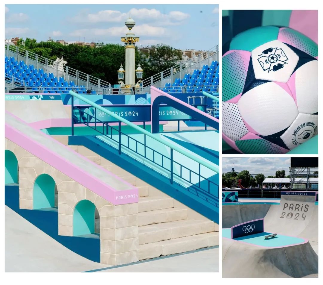 球类一个个色彩缤纷,像刚从芭比乐园借来的,粉绿白搭配的足球、紫色的羽毛球、粉黑撞色的乒乓球台,激不起任何赛前紧张,反而显得很是松弛,随时可以梦幻出片。