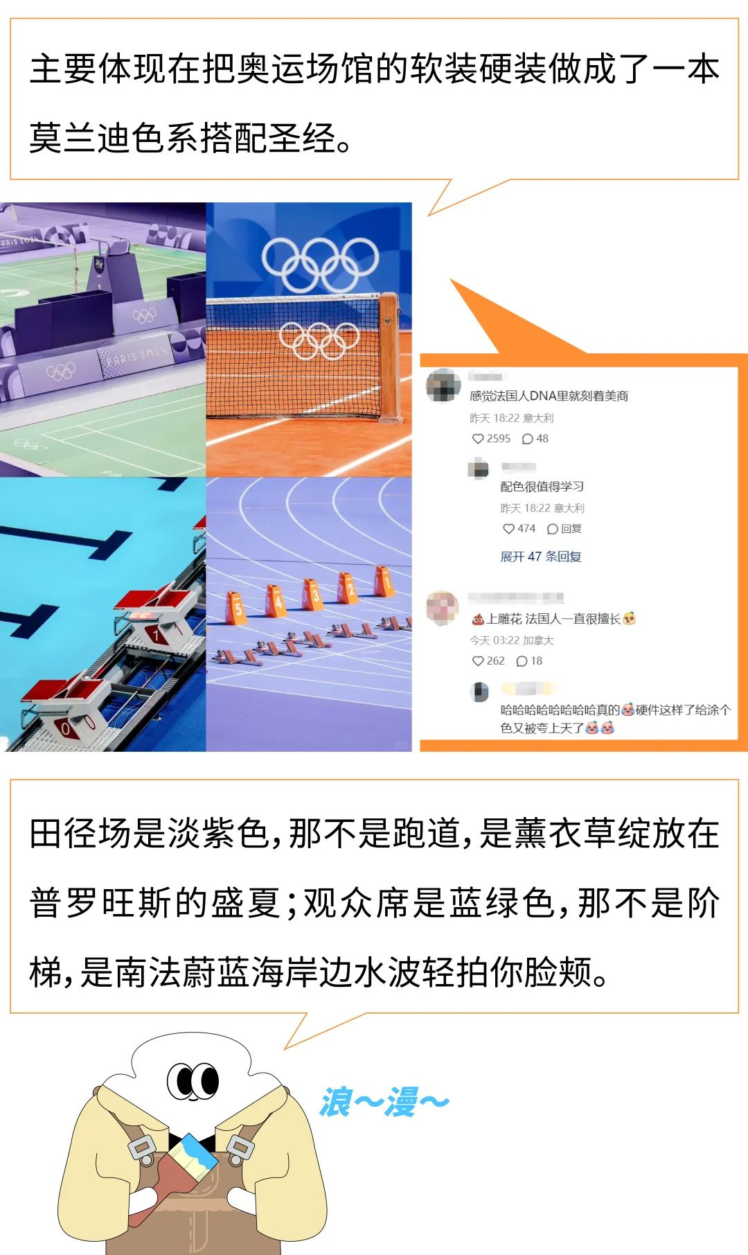 负责2024年巴黎奥运会田径运动的体育经理阿莱恩·布朗德尔认为,由蓝绿紫定调的赛事场馆外观,色彩搭配“令人震撼”,有鲜明的层次感,“无论是对眼睛还是转播画面都很不错。”