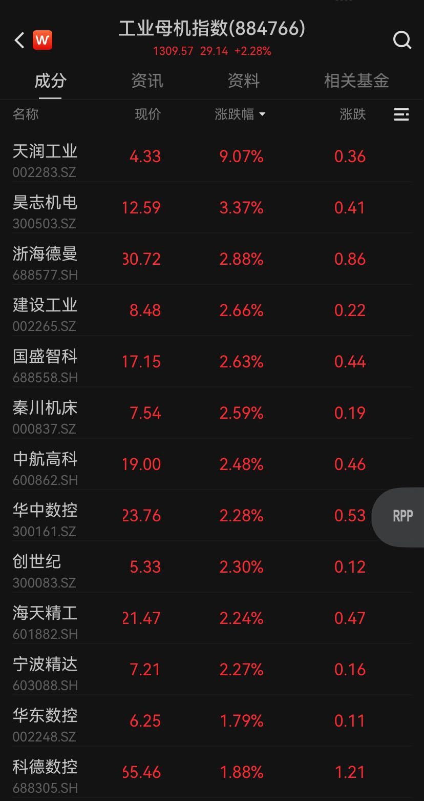 机器人概念走强,天润工业、宝塔实业等涨停,狄耐克、天奇股份等涨幅居前。