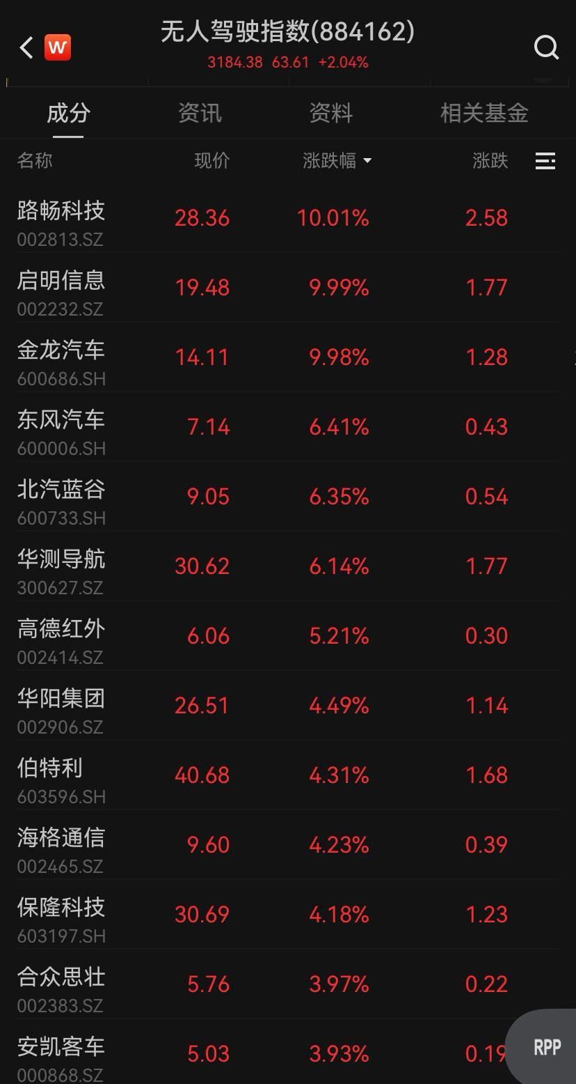 无人驾驶相关概念活跃,研奥股份20CM涨停,金龙汽车、路畅科技、中通客车等多股涨停。