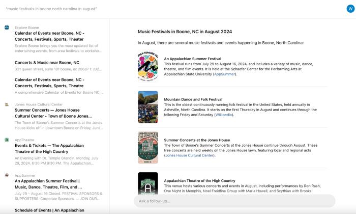 官方演示中的问题也附有具体的时间条件,例如“这周末什么时间可以在(加州)半月湾看到海兔?”“北卡Boone八月的音乐节”。这些问题都强调了SearchGPT的实时信息收集能力。