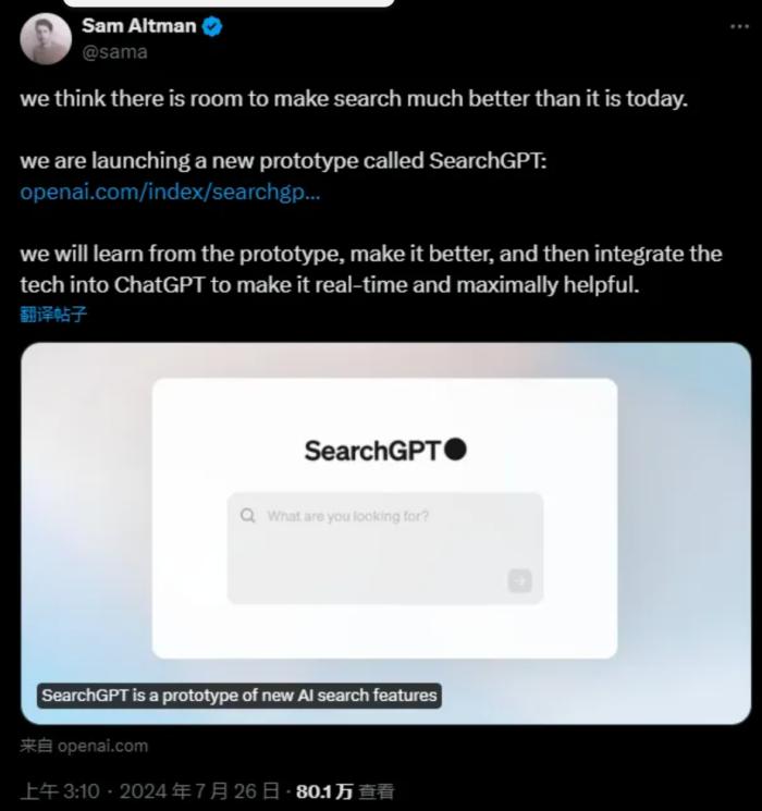 北京时间7月26日凌晨,OpenAI发布了名为"SearchGPT"的新人工智能搜索功能的临时原型。