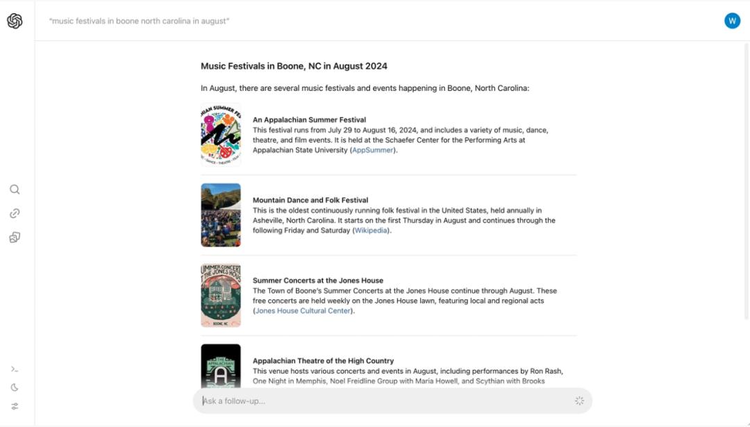 Matteo Wong 发现,给出的答案列表中排在首位的是阿巴拉契亚夏季艺术节,根据 SearchGPT 提供的信息,这个艺术节将从 7 月 29 日到 8 月 16 日举办一系列的艺术活动。
