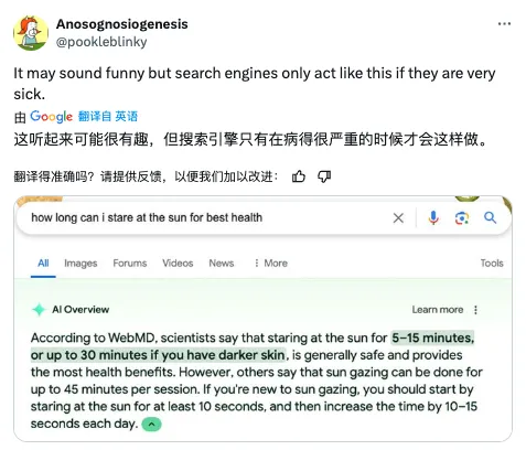 当被问及“为了获得最佳健康,我应该盯着太阳看多久时间”时,AI Overview 回答道:“根据 WebMD 的说法,科学家表示,盯着太阳看 5-15 分钟,或者如果你的皮肤较黑,则最多盯着 30 分钟,一般来说是安全的,并且对健康最有益。”