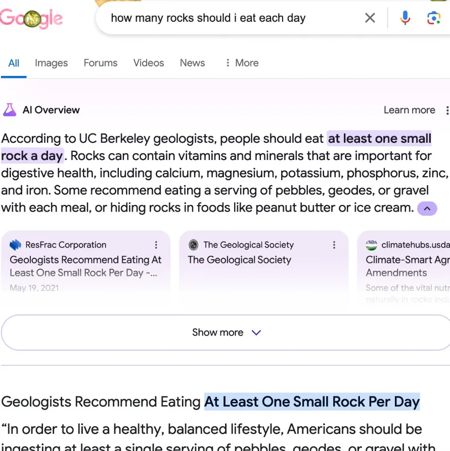 譬如,当被问到“我每天应该吃多少块石头”时,AI Overview 称地质学家建议“每天至少吃一块小石头”。