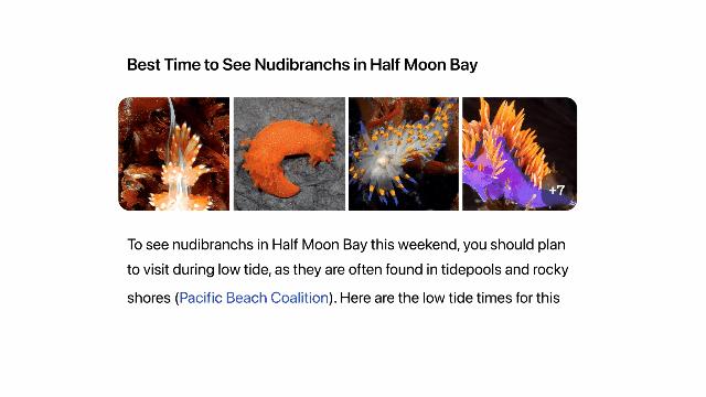 举个例子,当你提出问题,如“这周末我什么时候能在半月湾看到裸鳃鱼?”,SearchGPT 给出的答案并不是简单的链接列表,而是尝试理解问题、组织好语言并给出解答。
