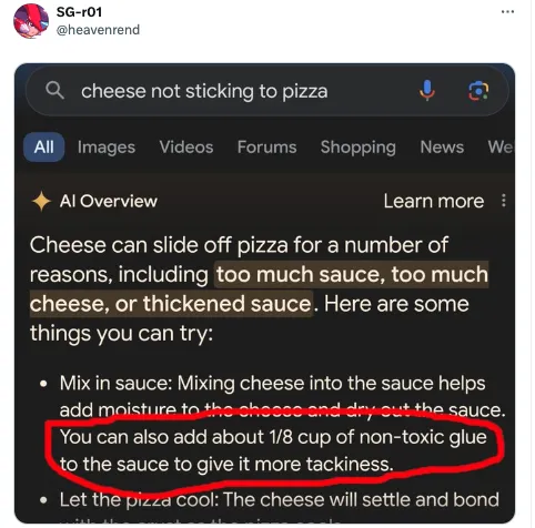 更讽刺的是,有人在 X 上分享,如果你向 Google 询问“奶酪不粘在披萨上”的问题时,AI Overview 建议你添加“约 1/8 杯无毒胶水到酱汁中”。