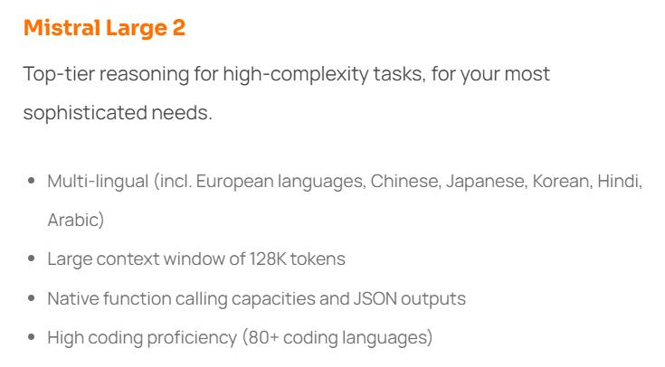 Large 2拥有128k上下文长度,可以在单次对话中接收约等于一本300页书的字符数。此外,Large 2还支持多种语言,能够处理包括英语、法语、德语、西班牙语、意大利语、葡萄牙语、阿拉伯语、印地语、俄语、中文、日语和韩语,以及80种代码语言。