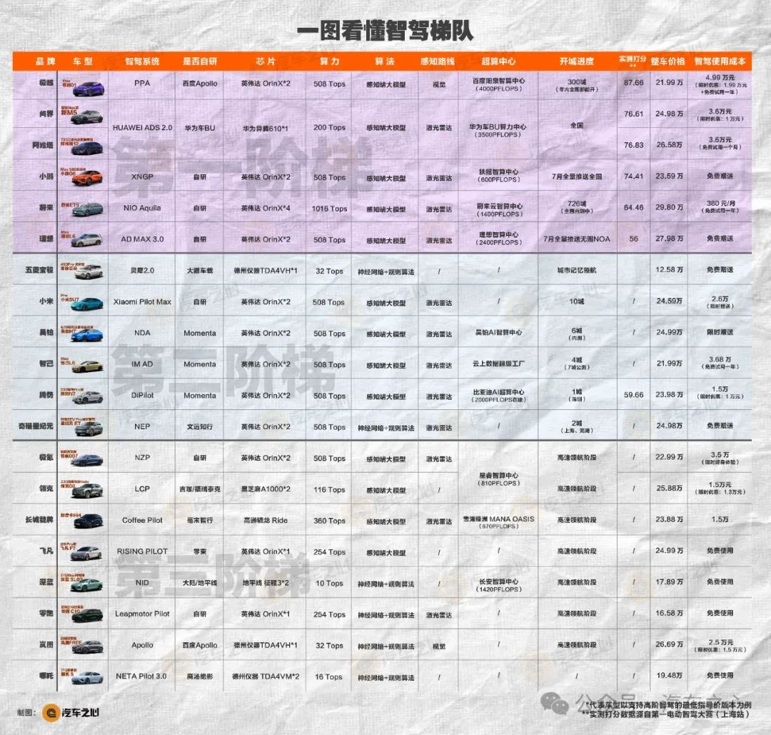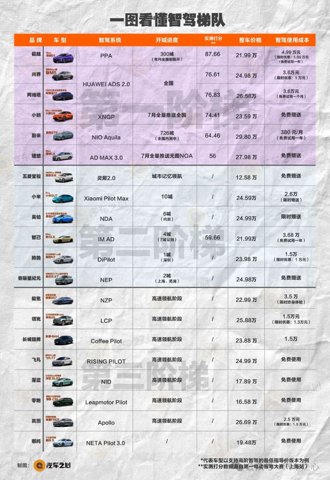 智驾梯队图是为了更直观的展现出各家车企实力,以及为用户提供一份智驾选购指南,避免花大钱、当大冤种。