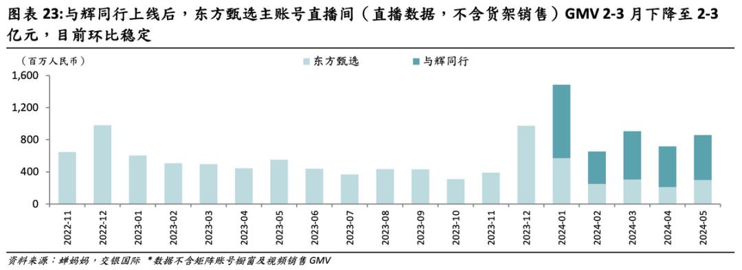 另外,我们考虑到没有了董宇辉的东方甄选直播间虽然受影响较大,但GMV也并没有直接脚踝斩,而是和与辉同行实现了共赢——带动东方甄选集团整体GMV增长50-100%。