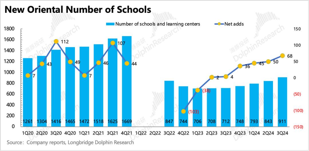 除此之外,海豚君对上季度业绩还相对积极的原因在于,新东方进一步加速了学习中心的设立。虽然短期难免会影响利润率提升的进度,但在我们看来,这个表明供不应求状况还将持续一段时间(新东方管理层在双减之后,对于扩容的节奏一直比较谨慎、理性)。
