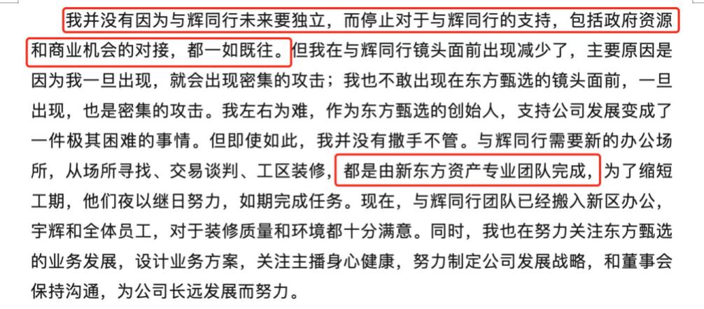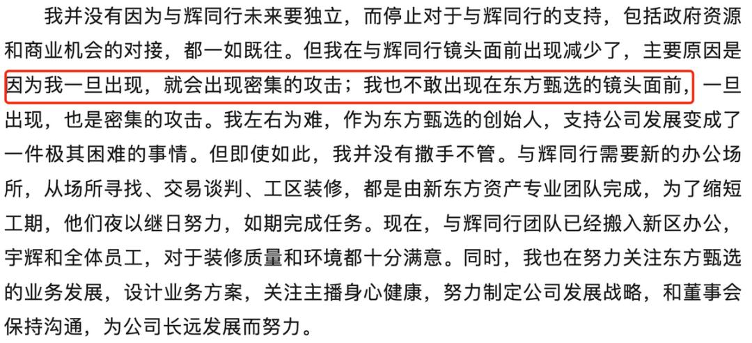 但不管怎样董宇辉与东方甄选切割,与董事长俞敏洪的关系始终未断掉,在一定程度上,甚至可以说两人是存在利益捆绑的。(与辉同行独立后的新办公室由新东方资产专业团队完成落地,且俞敏洪承诺会给与辉同行提供政府资源、商业机会)