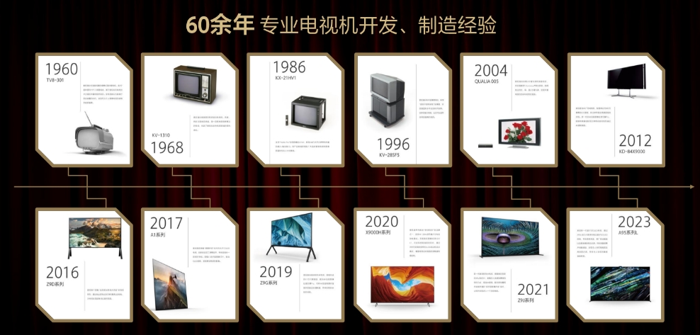 自1960年索尼第一台便携式可直接观看晶体管电视机TV8-301发布起,索尼电视已有60多年的深厚积累。创新同样根植于索尼电视的DNA,60多年来,索尼始终以各种前沿的显示技术引领行业的发展,首台平面电视,高清电视,LED背光电视,4K电视,屏幕发声电视以及量子点OLED电视,均诞生自索尼。2024年,索尼新一代影院电视7系、8系、9系也正式发布。