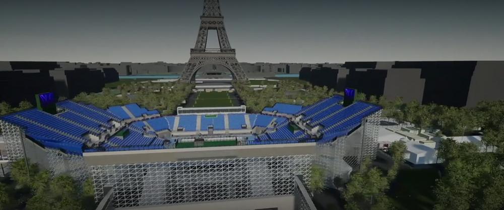 ▲埃菲尔铁塔下的临时沙排比赛场地(图源:IOC)