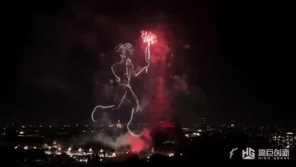 早在7月14日,中国科技已经在巴黎上演了一场视觉效果震撼的“赛博烟花”大秀:来自深圳龙岗高巨创新的1100架无人机编队腾空而起,结合埃菲尔铁塔造型,挂载绽放烟花,变换出多种奥运元素图案,令法国公众大饱眼福。