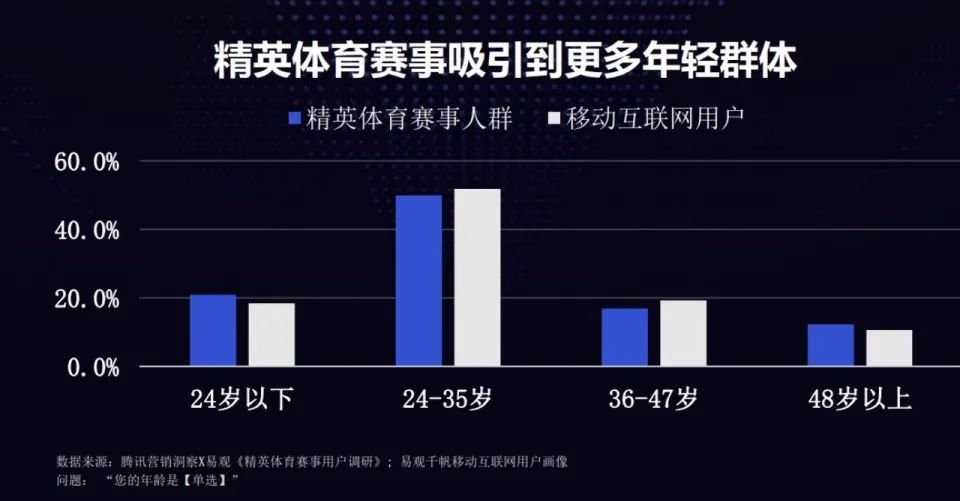 《中国精英体育赛事商业价值观察》报告还指出,关注网球、棒球、橄榄球等精英体育赛事的人群与移动互联网用户年龄分布特点相似,24岁至35岁年轻群体总数近半。
