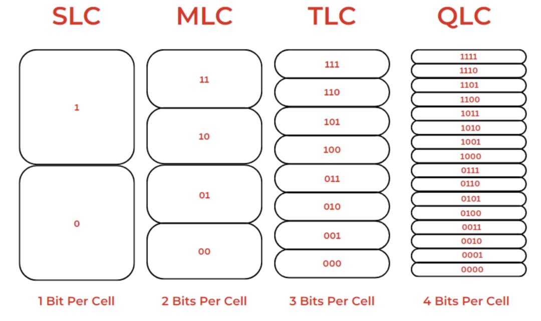 其实QLC和TLC指的都是NAND闪存,QLC全称Quad-Level Cells(四层单元),因每单元可以存放四位数据而得名。TLC、MLC和SLC分别指三层、多层(两层)和单层单元,分别能存放三位、两位、一位数据。QLC的信息存储密度最大,SLC的存储密度最低。