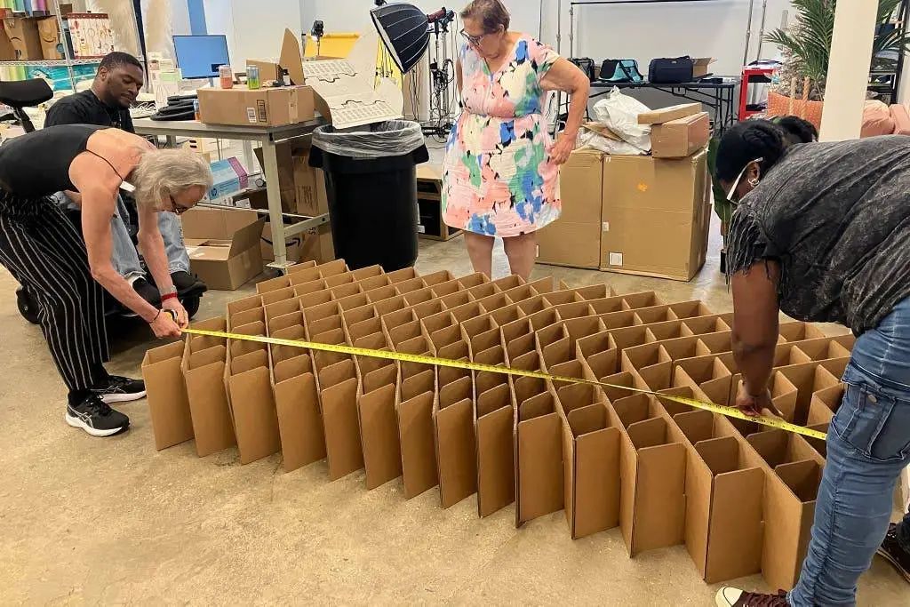 Mizutani 一直用纸板做一些对社会有意义事情,于是抓住了这次机会,设计了用 12 个箱子组装而成的纸板床。