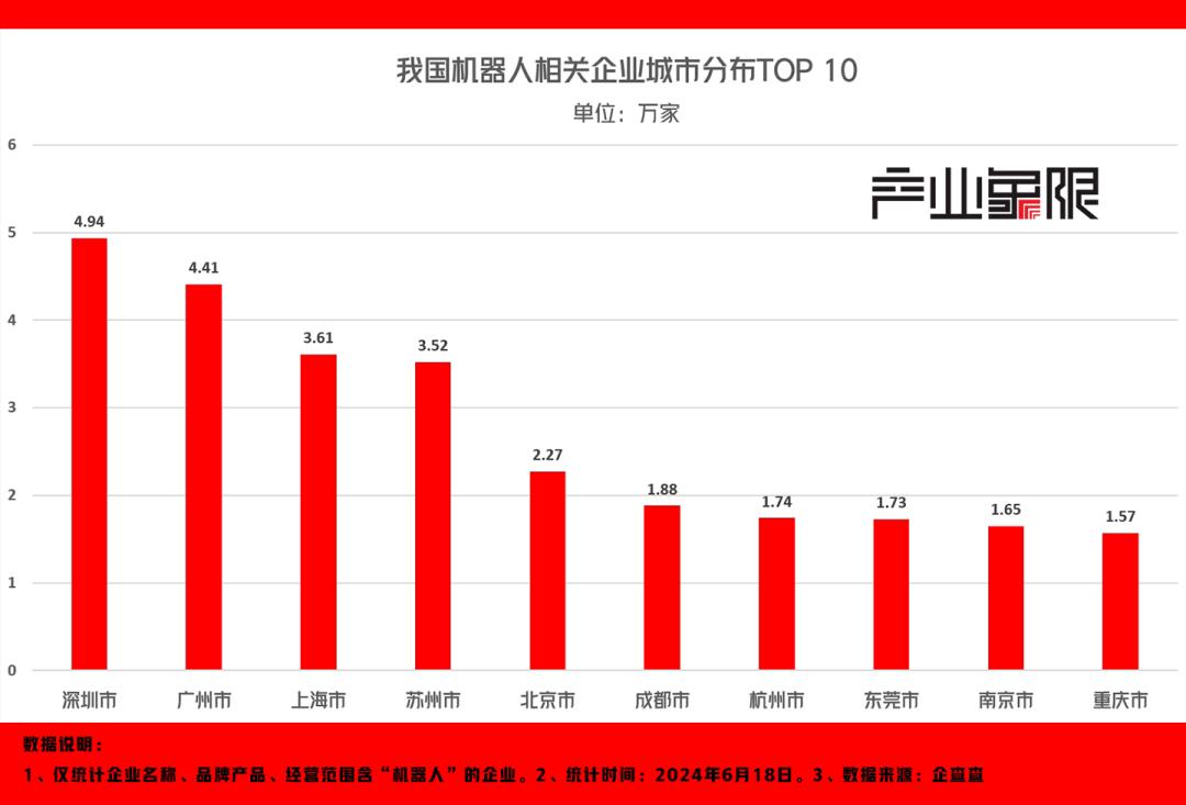 这一点从更大范围上我们能看得更清楚。据企查查数据显示,目前我国机器人相关企业主要集中在深圳、广州、上海和苏州,这四个城市分别拥有4.94万、4.41万、3.61万和3.52万家相关企业。