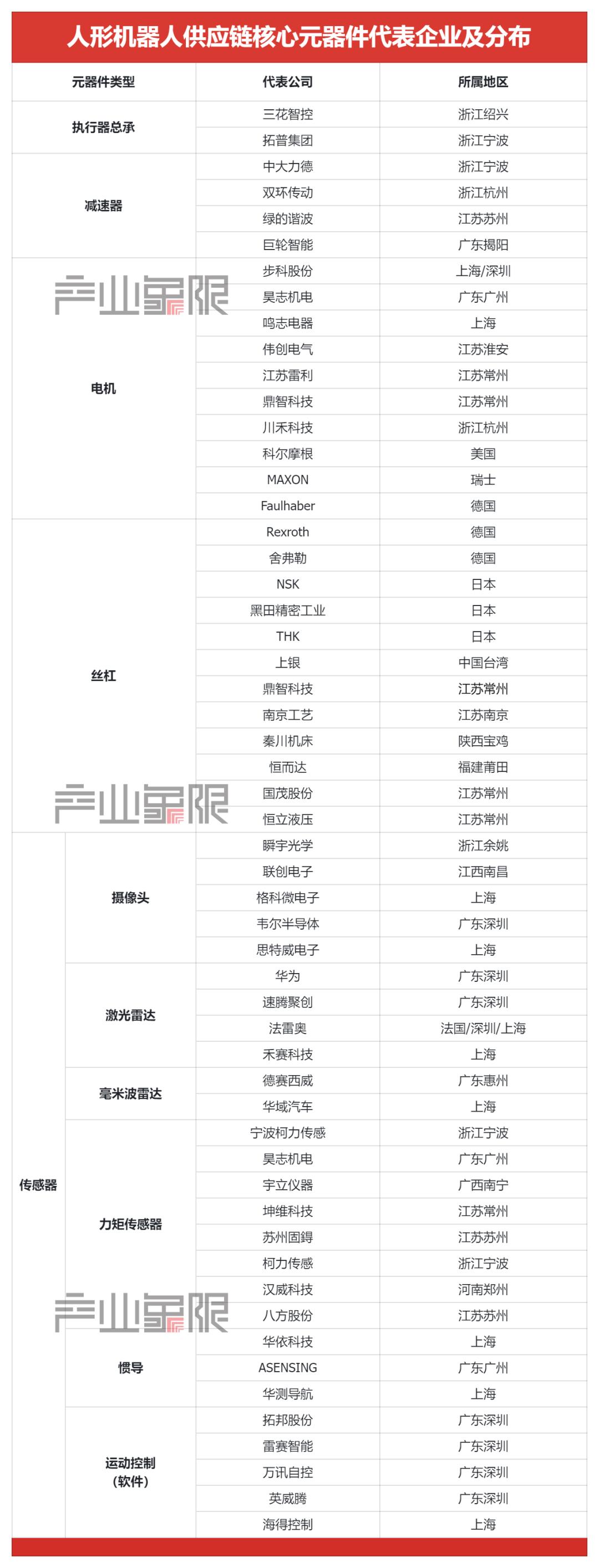 图:人形机器人供应链核心元器件代表企业及分布,产业象限制图