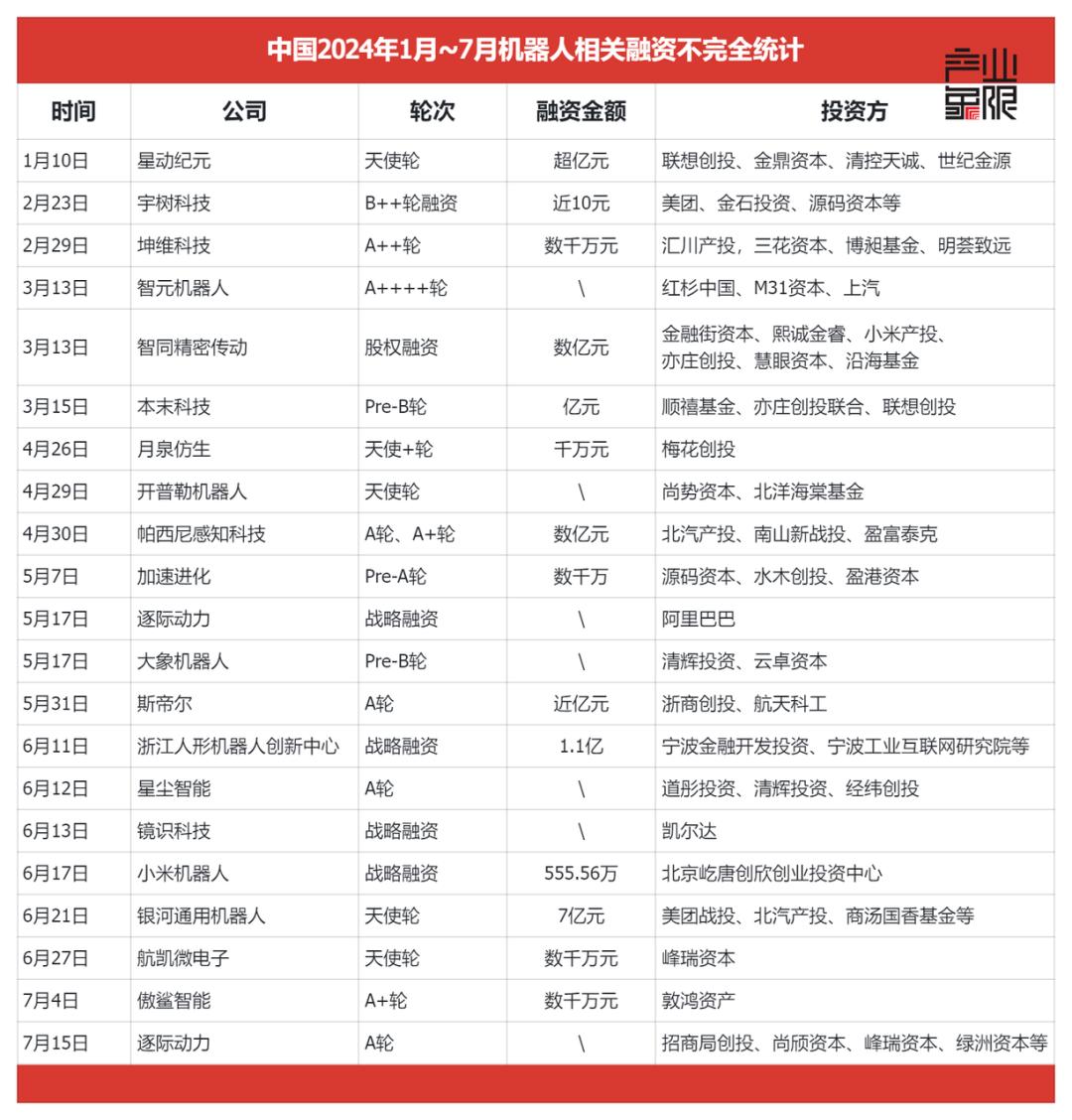据「产业象限」不完全统计,2024年上半年,全球人形机器人领域共完成22起融资,总金额超70亿元。其中中国人形机器人领域完成融资13起,总融资金额超25亿元。