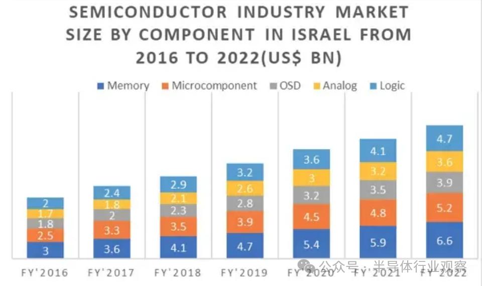 据reogma统计2016-2022年数据显示,存储占据以色列半导体市场最大份额,其次是电源管理IC、逻辑芯片、OSD(On Screen Display)以及模拟芯片。