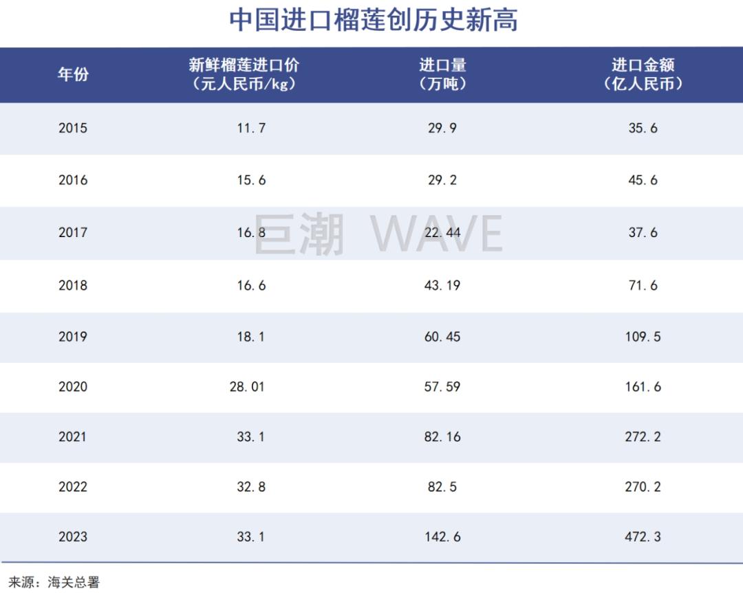 也就是说,中国几乎是榴莲的唯一市场。2023年我国进口新鲜榴莲超过142万吨,同比大增72.85%,进口额472亿元,同比增长74.8%,均创历史新高。