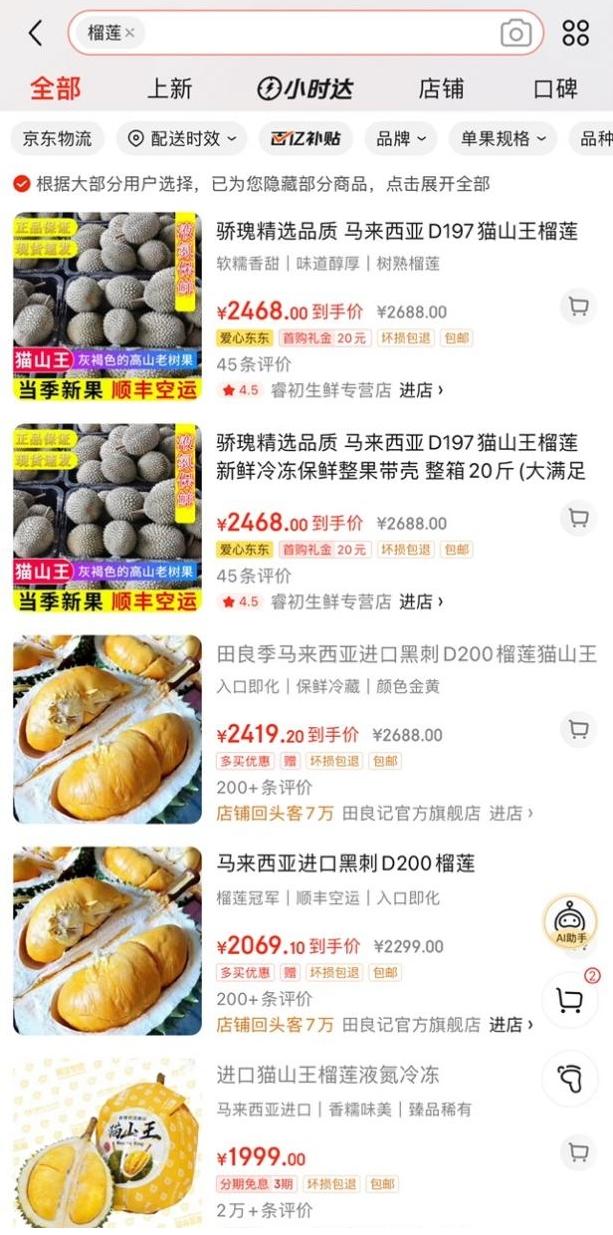稀有的马来西亚黑刺榴莲、猫山王榴莲同样十分昂贵。电商平台上,这两种榴莲价格也最高,一斤价格在100-200元左右。