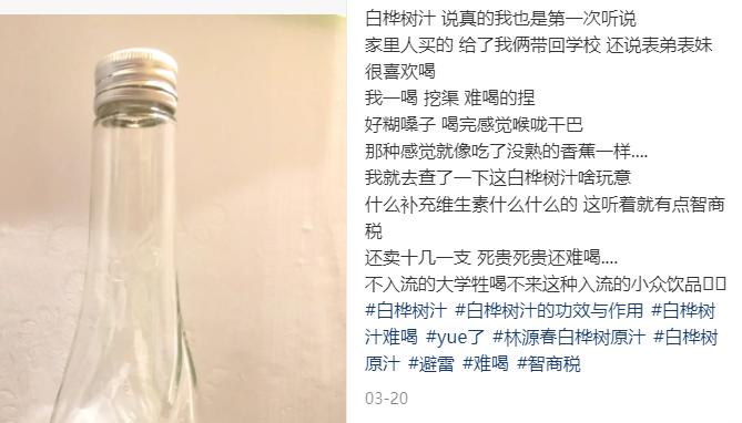 白桦树汁初步爆红就出现了被部分消费者诟病的现象,其中最为明显的是,在定价高端且难喝的基础上,少不了被消费者贴上智商税的名号,吐槽帖在社交平台最为常见。