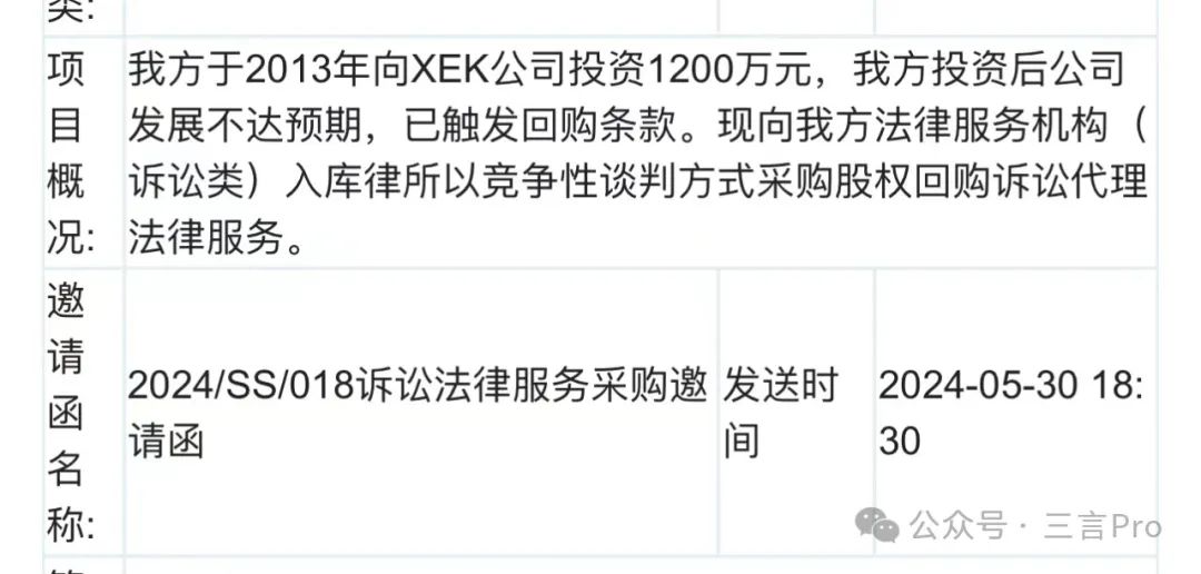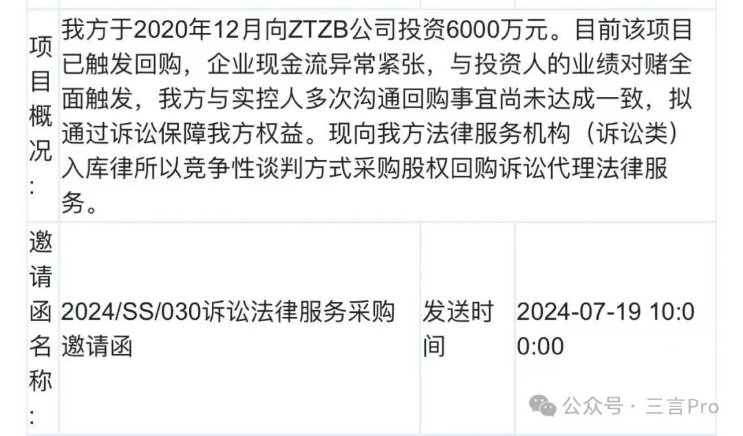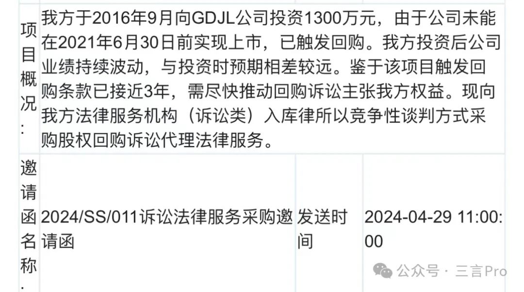 三言逐一整理发现,上述这51条法律服务采购招标邀请函中,2023年到2024年的48条全部是有关起诉被投企业的;而剩余的3条并不涉及起诉被投企业。