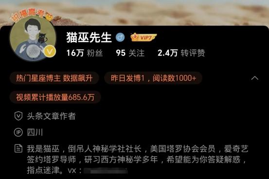 “猫巫”作为一个知名的专业塔罗师,光是塔罗牌占卜就能做到月入上万,但他不只是一个占卜师,他还是多家媒体平台的星象占卜专栏作者,全网阅读量超千万,也是多家教育视频平台的签约塔罗导师,精心制作的视频课程受到许多人关注。