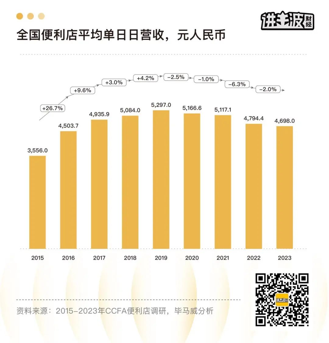 《2024年中国便利店发展报告》显示,受线下消费“量增价减”的影响,便利店客单价总体有所回落,单店单日营收为4698元,同比2022年下降2.0%。
