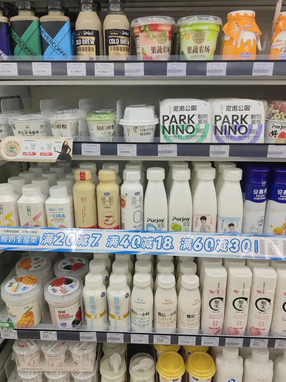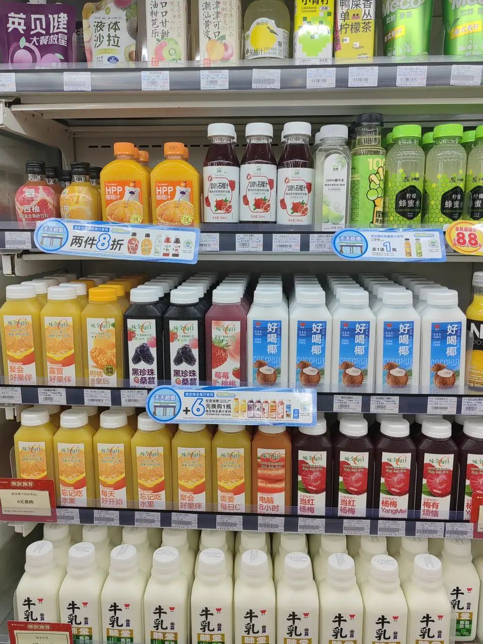 公司楼下的罗森和全家,几乎天天都在打折。9.9元2瓶的AD钙奶、10元3瓶的康师傅奶茶、6.3元2瓶的消消乳......饮料的价格被压到3、4元一瓶,和瓶装水差不多。据店员透露:“现在便利店生意不好做了,几步一家店,卖的产品也都差不多,只能时不时搞个活动引流。”