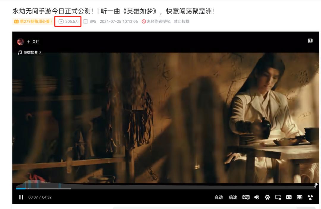 首先在产品正式公测前夕,《永劫无间手游》项目组就各主要媒体平台对产品推广曲《英雄如梦》进行了预告,而在公测当天在B站正式发布推广,截至7月29日,该视频在B站已经超过200万次的播放量。